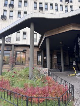 В доме имеется стилобат, где расположена детская площадка.