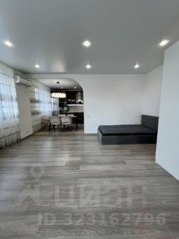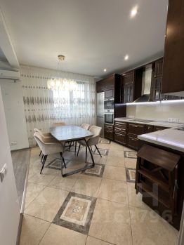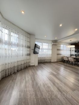 Просторная гостиная, объединённая с кухней, украшенная большими окнами, выходящими сразу на две стороны света, создавая ощущение простора и наполненности светом, встроенный кухонный гарнитур выполнен из массива дерева;