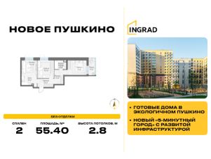 Прямая продажа от девелопера. В жилом квартале комфорт-класса "Новое Пушкино" (девелопер Ingrad) продаётся 2-спальная квартира площадью 55.40 кв.м без отделки. Квартира расположена на 10 этаже 15-этажного дома, корпус 21.