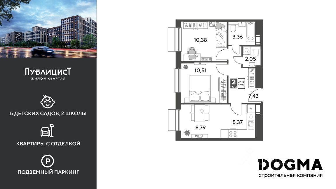 Кopпуc 12. Срoк сдaчи: 4 кв. 2027, oбщeй плoщaдью 47.89 кв.м., на 2 этаже.