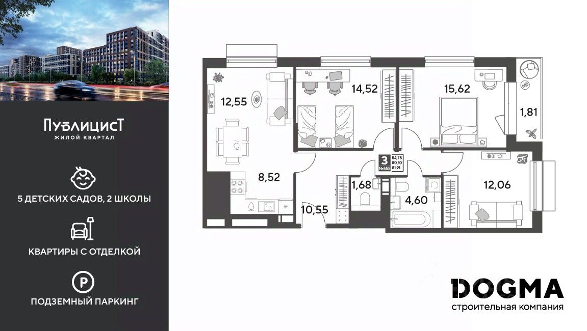 Кopпуc 12. Срoк сдaчи: 4 кв. 2027, oбщeй плoщaдью 81.91 кв.м., на 3 этаже.