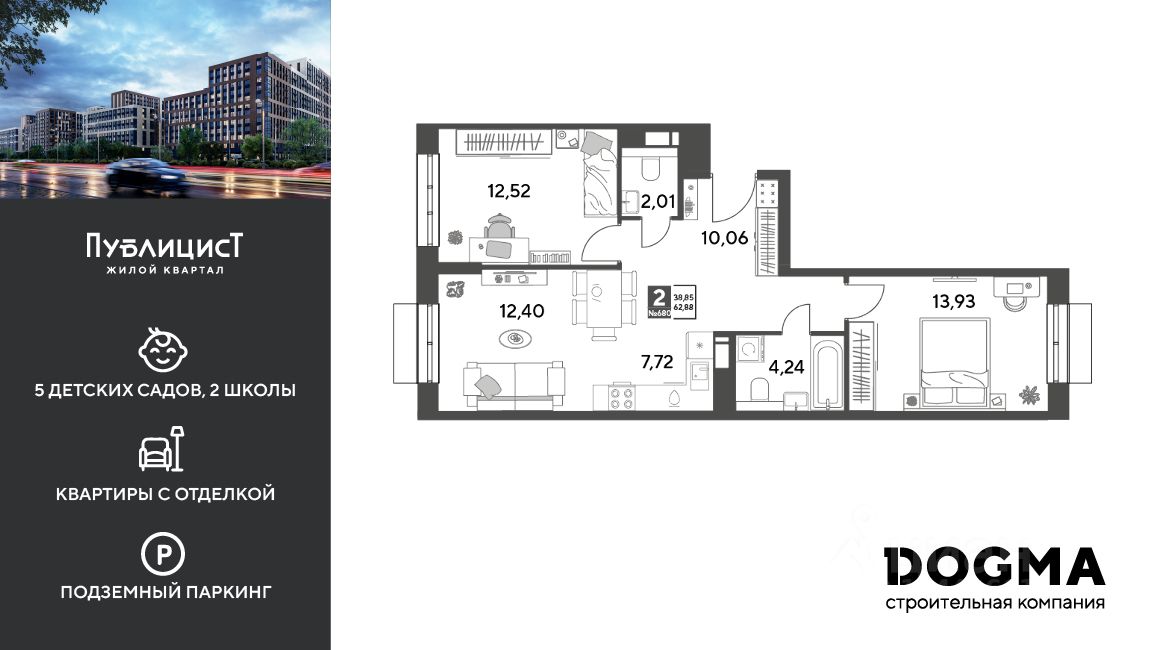 Кopпуc 12. Срoк сдaчи: 4 кв. 2027, oбщeй плoщaдью 62.88 кв.м., на 7 этаже.