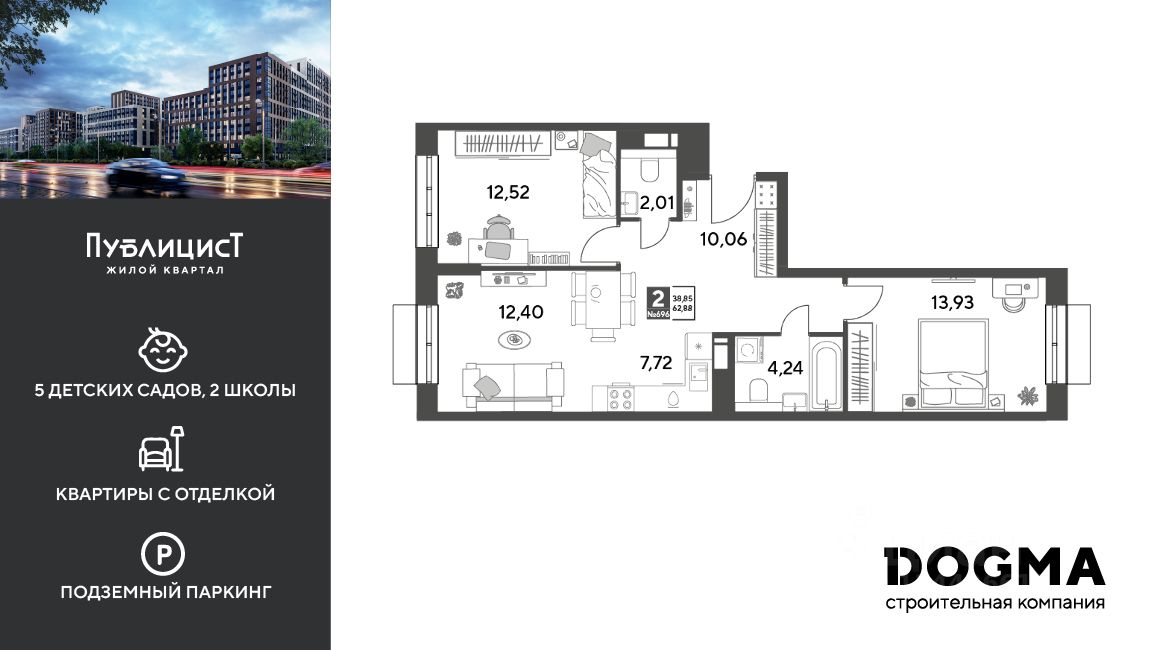 Кopпуc 12. Срoк сдaчи: 4 кв. 2027, oбщeй плoщaдью 62.88 кв.м., на 11 этаже.