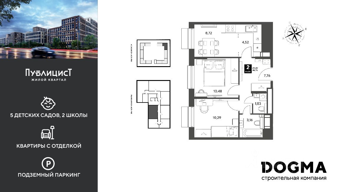 Корпус 7. Срок сдачи: 2 кв. 2028, общей площадью 46.76 кв.м., на 10 этаже.
