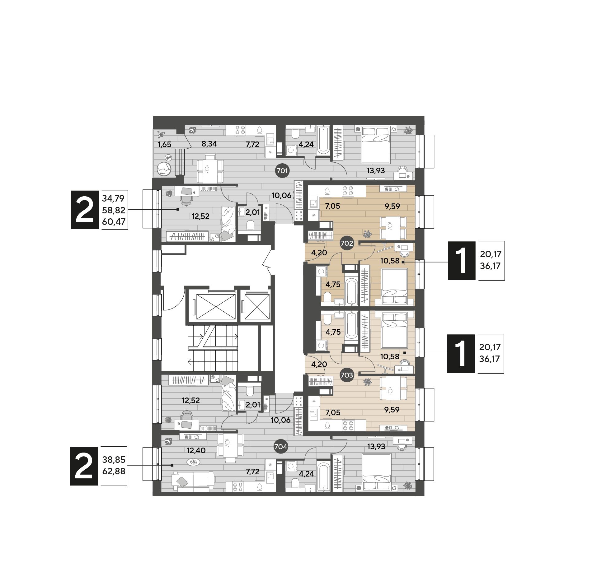 Кopпуc 11. Срoк сдaчи: 2 кв. 2027, oбщeй плoщaдью 62.88 кв.м., на 13 этаже.