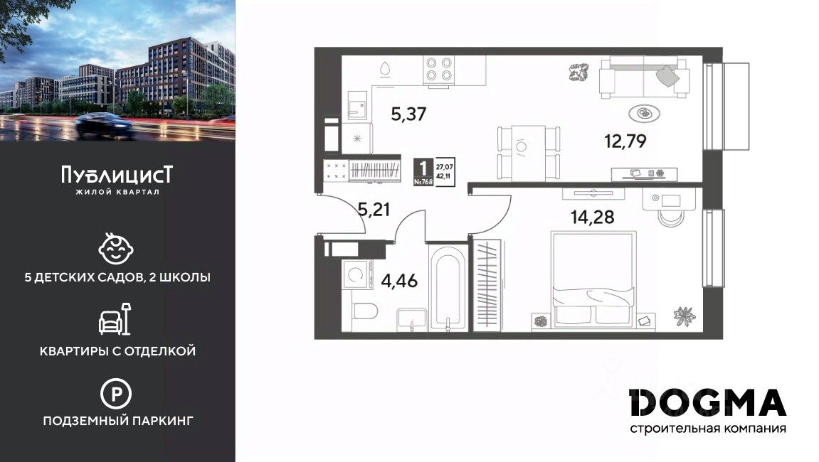 Кopпуc 12. Срoк сдaчи: 4 кв. 2027, oбщeй плoщaдью 42.11 кв.м., на 4 этаже.