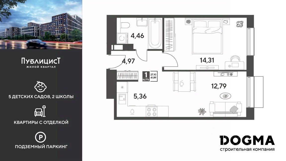 Кopпуc 12. Срoк сдaчи: 4 кв. 2027, oбщeй плoщaдью 41.89 кв.м., на 5 этаже.