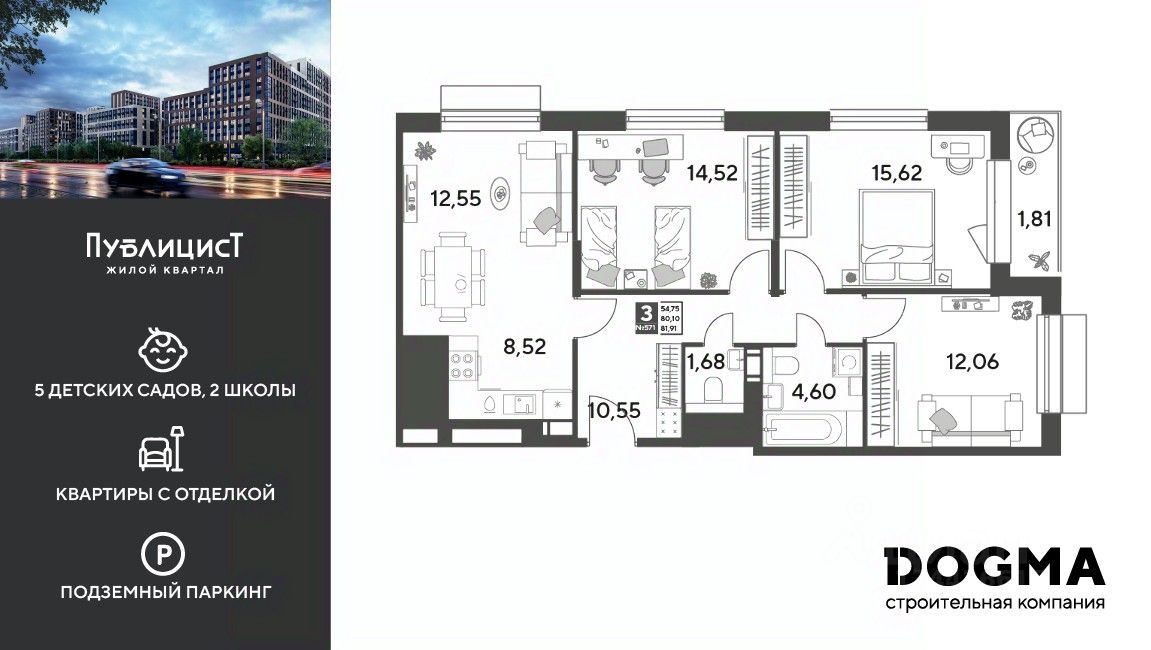 Кopпуc 11. Срoк сдaчи: 2 кв. 2027, oбщeй плoщaдью 81.91 кв.м., на 5 этаже.