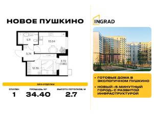 Прямая продажа от девелопера. В жилом квартале комфорт-класса "Новое Пушкино" (девелопер Ingrad) продаётся 1-спальная квартира площадью 34.40 кв.м без отделки. Квартира расположена на 7 этаже 14-этажного дома, корпус 23.