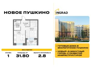 Прямая продажа от девелопера. В жилом квартале комфорт-класса "Новое Пушкино" (девелопер Ingrad) продаётся 1-спальная квартира площадью 31.80 кв.м без отделки. Квартира расположена на 9 этаже 14-этажного дома, корпус 23.