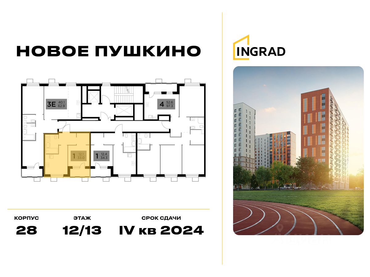 Прямая продажа от девелопера. В жилом квартале комфорт-класса "Новое Пушкино" (девелопер Ingrad) продаётся 1-спальная квартира площадью 31.30 кв.м без отделки. Квартира расположена на 12 этаже 13-этажного дома, корпус 28.