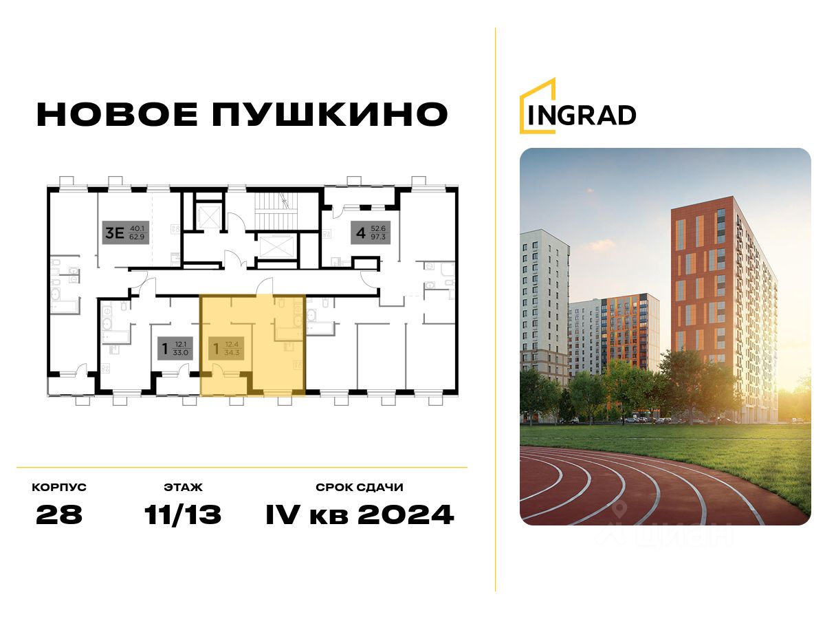 Прямая продажа от девелопера. В жилом квартале комфорт-класса "Новое Пушкино" (девелопер Ingrad) продаётся 1-спальная квартира площадью 32.60 кв.м без отделки. Квартира расположена на 11 этаже 13-этажного дома, корпус 28.