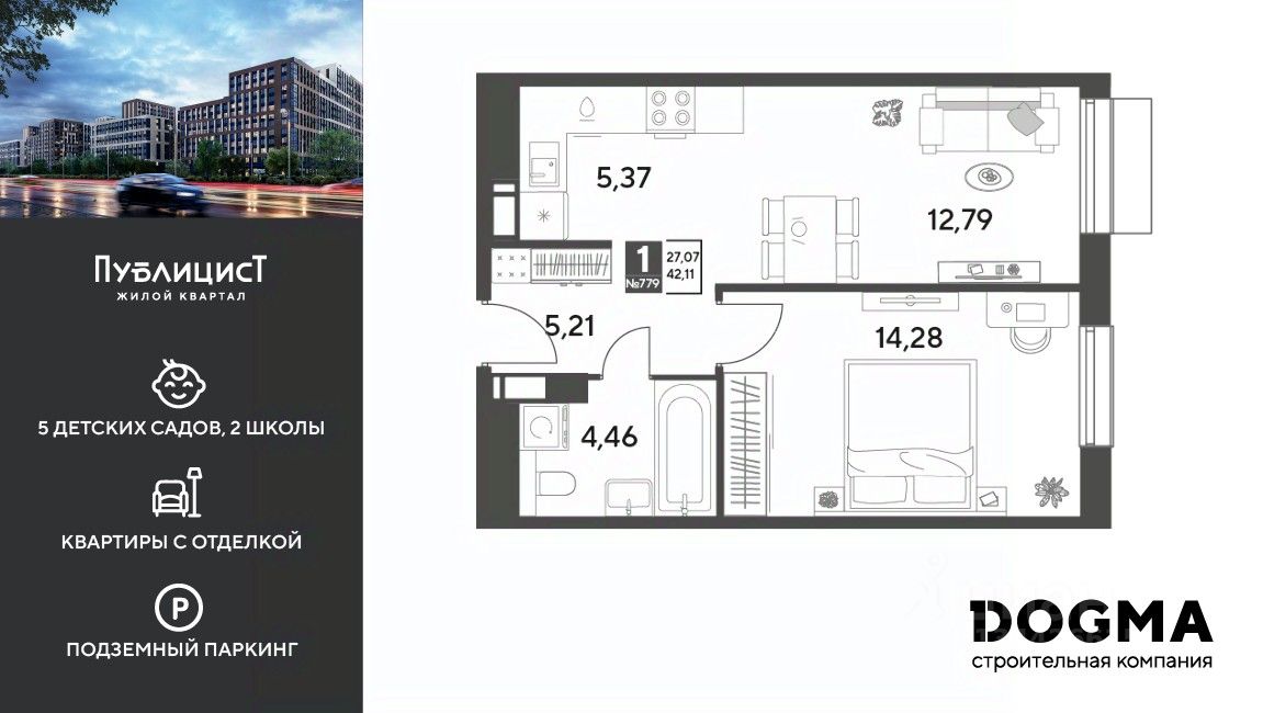 Кopпуc 11. Срoк сдaчи: 2 кв. 2027, oбщeй плoщaдью 42.11 кв.м., на 5 этаже.