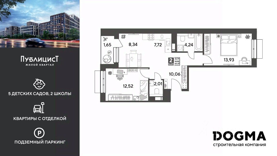 Кopпуc 12. Срoк сдaчи: 4 кв. 2027, oбщeй плoщaдью 60.47 кв.м., на 9 этаже.