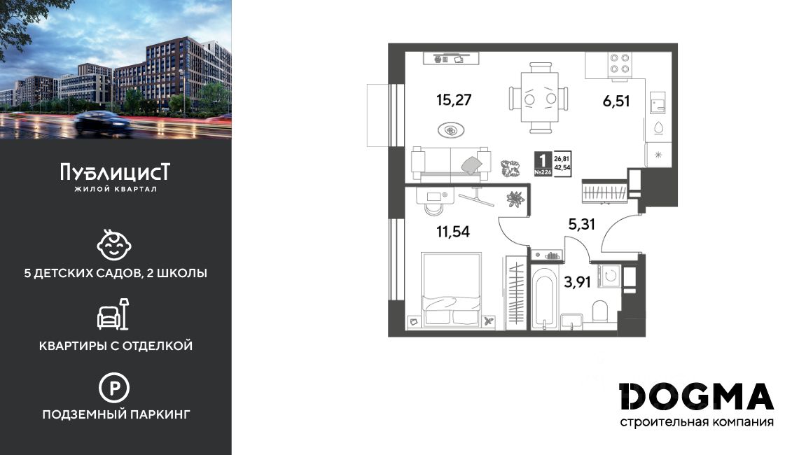 Кopпуc 11. Срoк сдaчи: 2 кв. 2027, oбщeй плoщaдью 42.54 кв.м., на 12 этаже.