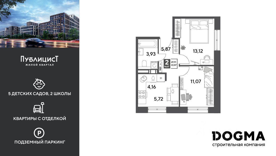 Кopпуc 12. Срoк сдaчи: 4 кв. 2027, oбщeй плoщaдью 43.87 кв.м., на 9 этаже.