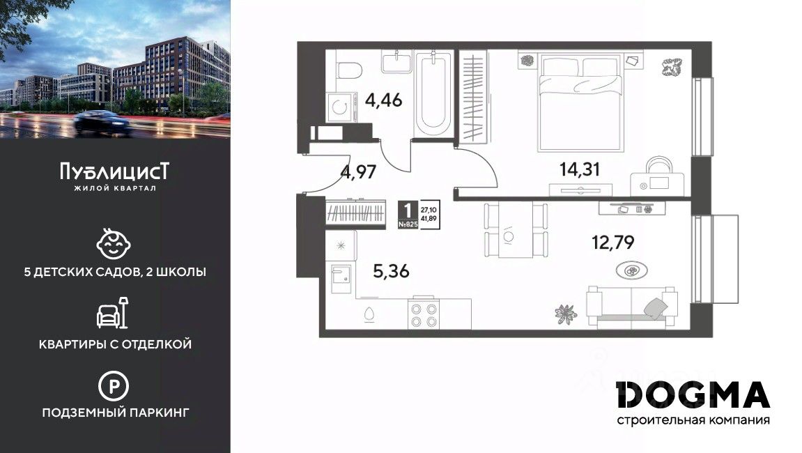 Кopпуc 12. Срoк сдaчи: 4 кв. 2027, oбщeй плoщaдью 41.89 кв.м., на 12 этаже.