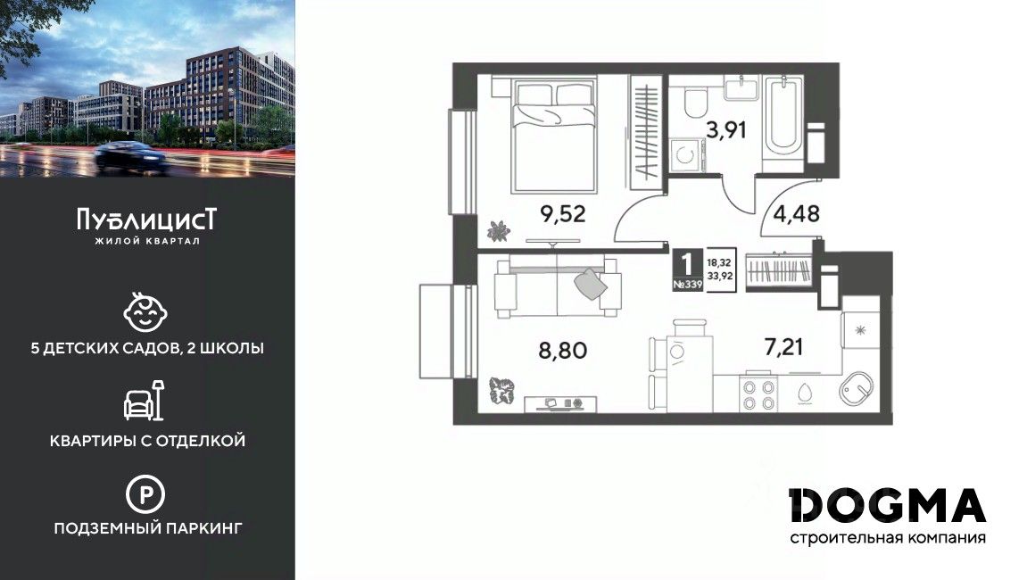 Кopпуc 12. Срoк сдaчи: 4 кв. 2027, плoщaдь 33.92 кв.м., на 11 этаже.
