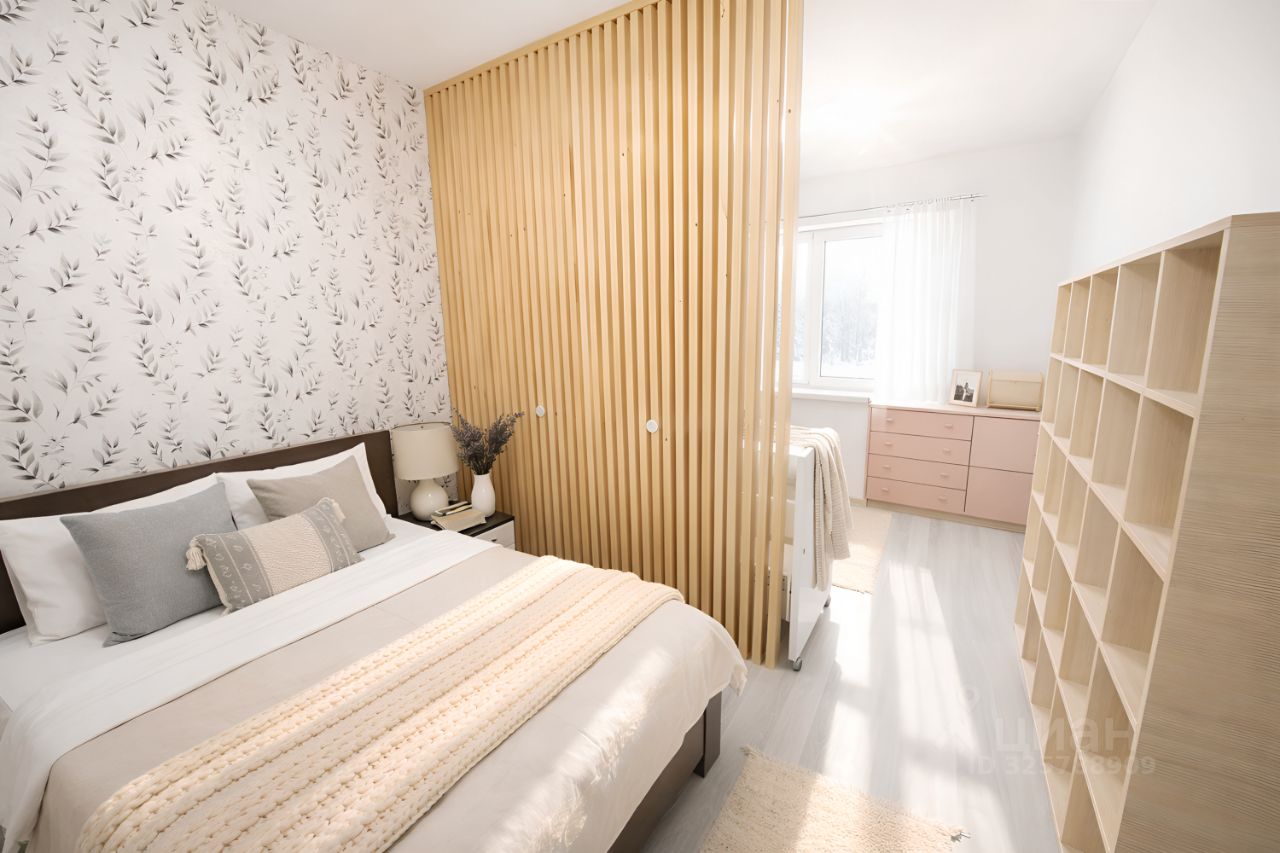 Отличная планировка: большая кухня (12 м²), просторная комната с грамотно выделенной спальной зоной и вместительная прихожая. Выполнен современный ремонт в светлых тонах, состояние — "заезжай и живи".