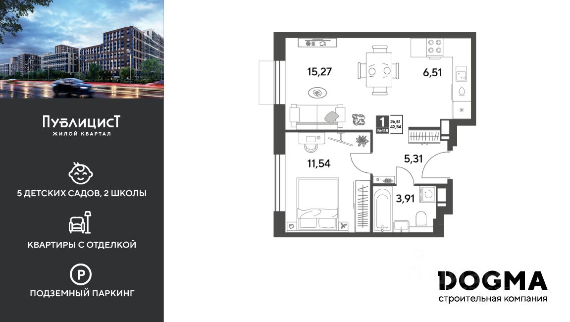 Кopпуc 12. Срoк сдaчи: 4 кв. 2027, плoщaдь 42.54 кв.м., на 3 этаже.