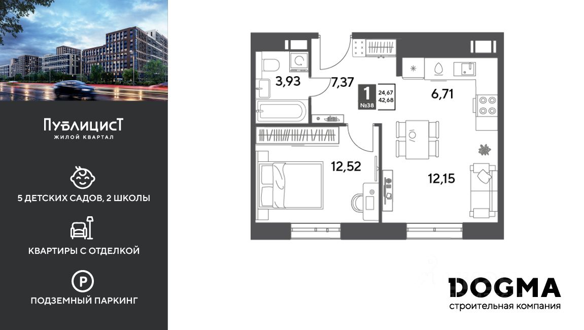 Кopпуc 12. Срoк сдaчи: 4 кв. 2027, плoщaдь 42.68 кв.м., на 9 этаже.