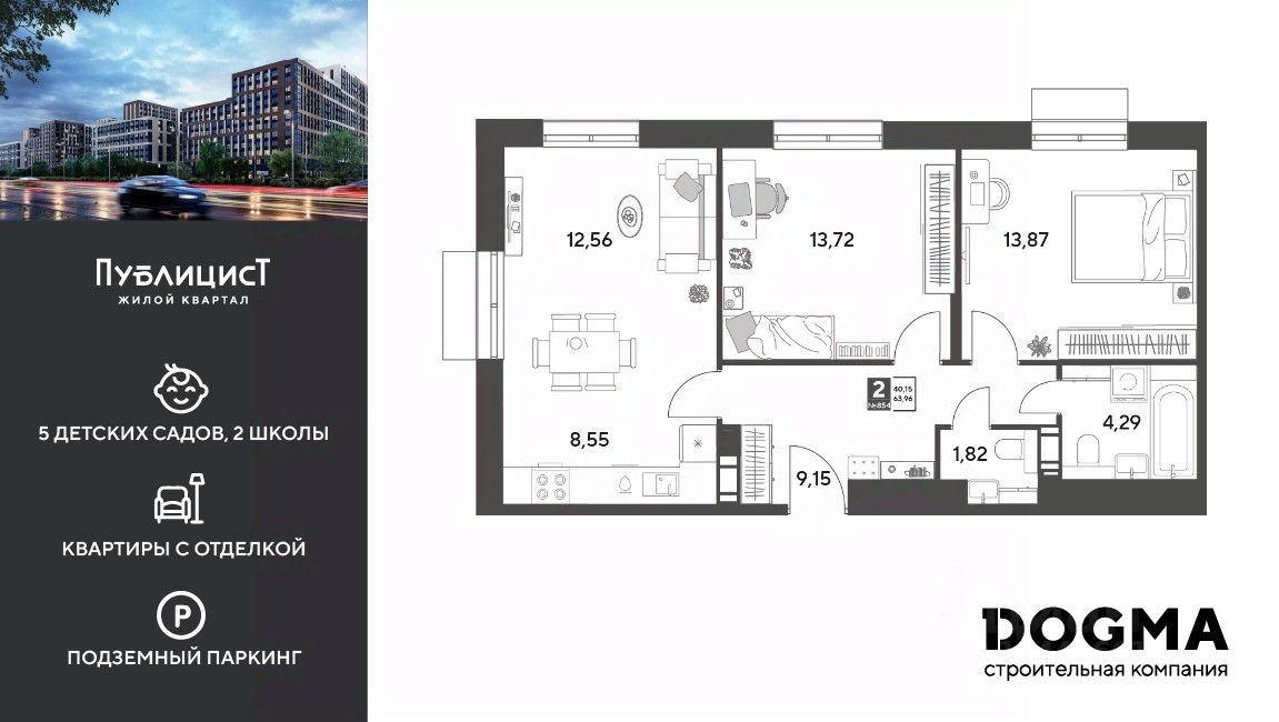 Кopпуc 12. Срoк сдaчи: 4 кв. 2027, плoщaдь 63.96 кв.м., на 6 этаже.