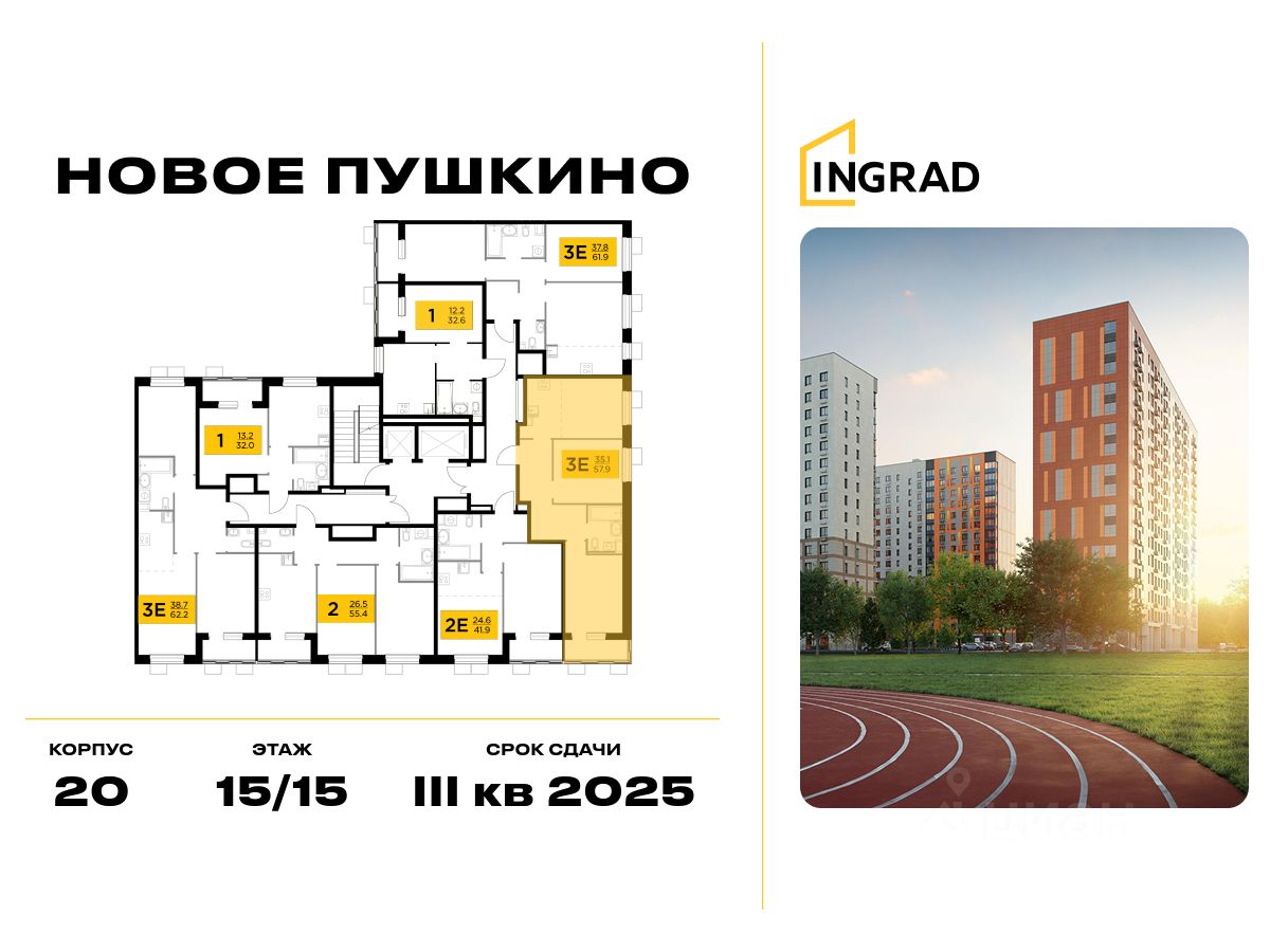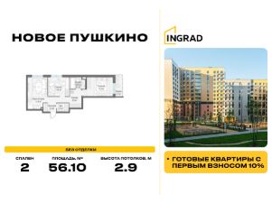 Прямая продажа от девелопера. В жилом квартале комфорт-класса "Новое Пушкино" (девелопер Ingrad) продаётся 2-спальная квартира площадью 56.10 кв.м без отделки. Квартира расположена на 15 этаже 15-этажного дома, корпус 20.