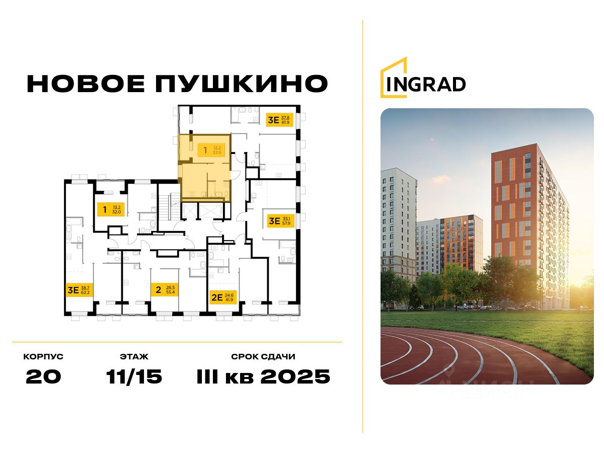 Прямая продажа от девелопера. В жилом квартале комфорт-класса "Новое Пушкино" (девелопер Ingrad) продаётся 1-спальная квартира площадью 31.00 кв.м без отделки. Квартира расположена на 11 этаже 15-этажного дома, корпус 20.