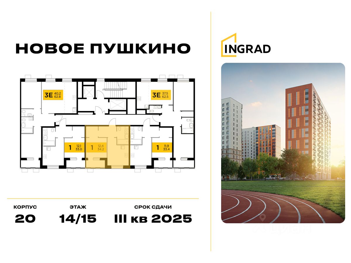 Прямая продажа от девелопера. В жилом квартале комфорт-класса "Новое Пушкино" (девелопер Ingrad) продаётся 1-спальная квартира площадью 32.70 кв.м без отделки. Квартира расположена на 14 этаже 15-этажного дома, корпус 20.