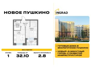 Прямая продажа от девелопера. В жилом квартале комфорт-класса "Новое Пушкино" (девелопер Ingrad) продаётся 1-спальная квартира площадью 32.10 кв.м без отделки. Квартира расположена на 13 этаже 14-этажного дома, корпус 23.