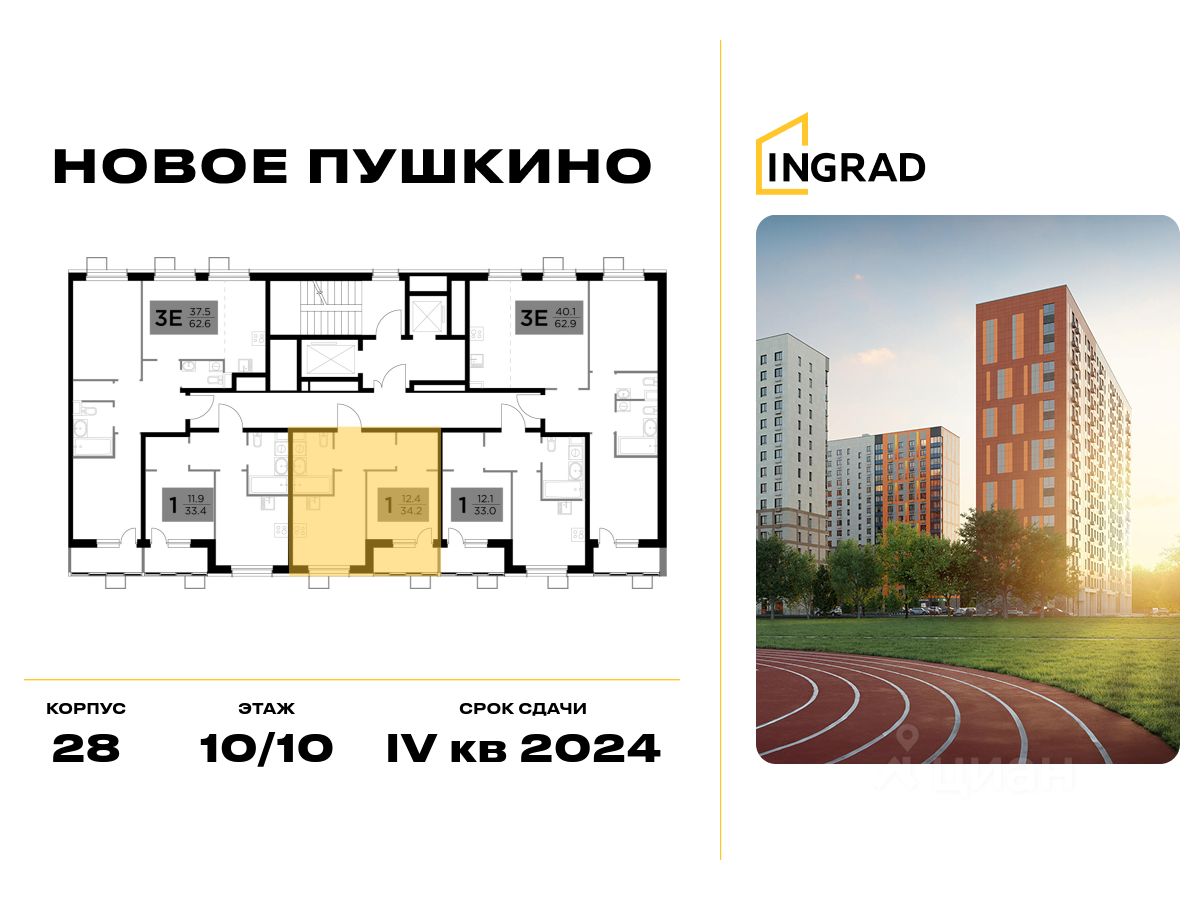 Прямая продажа от девелопера. В жилом квартале комфорт-класса "Новое Пушкино" (девелопер Ingrad) продаётся 1-спальная квартира площадью 32.20 кв.м без отделки. Квартира расположена на 10 этаже 10-этажного дома, корпус 28.
