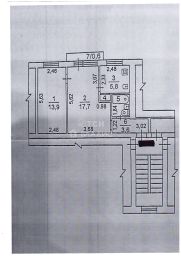 Расположена по адресу Московский проспект дом 16 на 4 этаже 5-ти этажного кирпичного дома. Общая площадь квартиры 44,4 метров, комнаты смежные 17,7 и 13,9 метров, кухня 5,8 метров, СУЗ совмещенный, застекленный балкон.