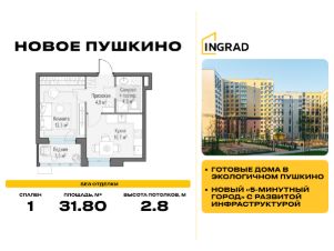 Прямая продажа от девелопера. В жилом квартале комфорт-класса "Новое Пушкино" (девелопер Ingrad) продаётся 1-спальная квартира площадью 31.80 кв.м без отделки. Квартира расположена на 13 этаже 14-этажного дома, корпус 21.