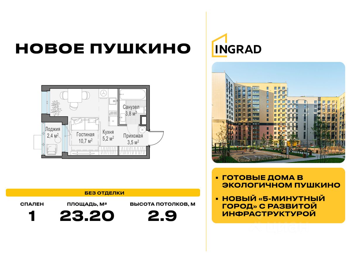 Прямая продажа от девелопера. В жилом квартале комфорт-класса "Новое Пушкино" (девелопер Ingrad) продаётся студия площадью 23.20 кв.м без отделки. Квартира расположена на 15 этаже 15-этажного дома, корпус 21.
