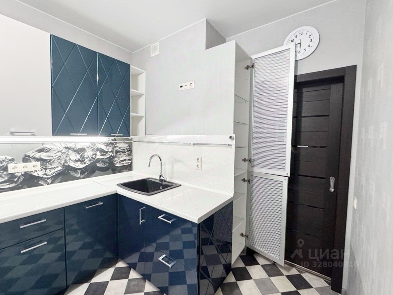 Кухня-хамелеон изумрудно-синего цвета, оборудована современной техникой - варочная панель, духовой шкаф, посудомоечная машина.