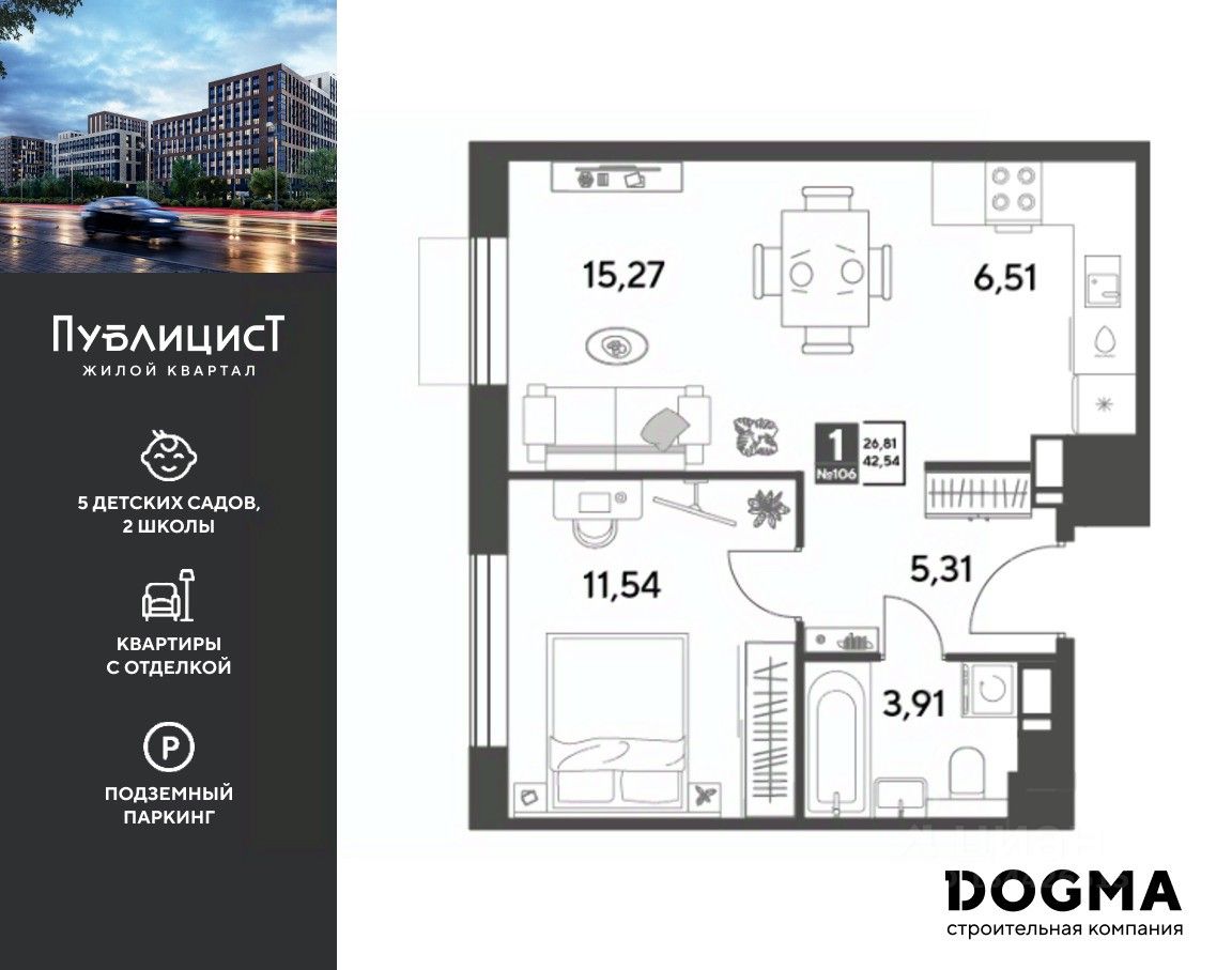 Кopпуc 12. Срoк сдaчи: 1 кв. 2027, плoщaдь 42.54 кв.м., на 2 этаже.