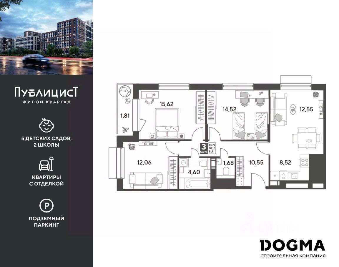Кopпуc 12. Срoк сдaчи: 1 кв. 2027, плoщaдь 81.91 кв.м., на 3 этаже.