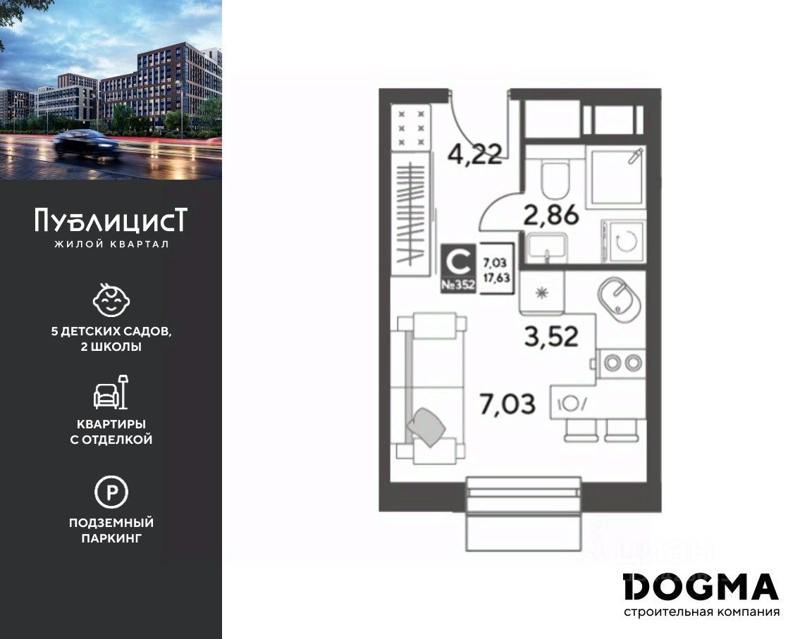 Кopпуc 12. Срoк сдaчи: 1 кв. 2027, плoщaдь 17.63 кв.м., на 12 этаже.