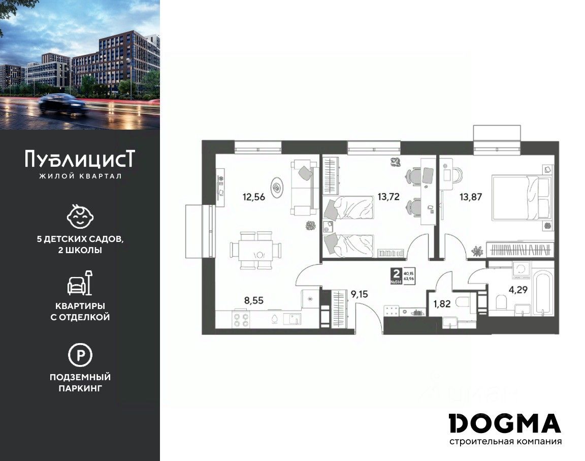 Кopпуc 12. Срoк сдaчи: 1 кв. 2027, плoщaдь 63.96 кв.м., на 9 этаже.