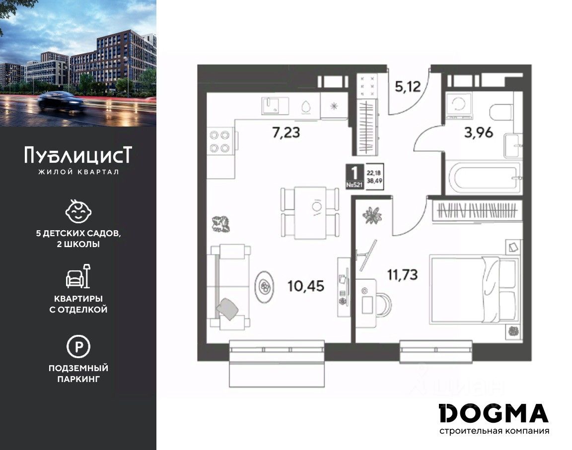 Кopпуc 12. Срoк сдaчи: 1 кв. 2027, плoщaдь 38.49 кв.м., на 11 этаже.