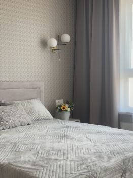 Ремонт сделан с душой и чувством стиля. Для вас заказали пошив штор, подготовили спальное место в комнате и разместили уютный диван на кухне.