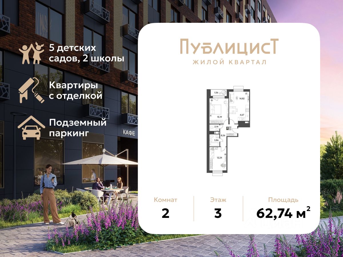В продаже 2-комнатная квартира площадью 62.74 кв. м на 3 этаже. Квартира расположена в современном жилом комплексе "Публицист" от DOGMA, в корпусе 7.