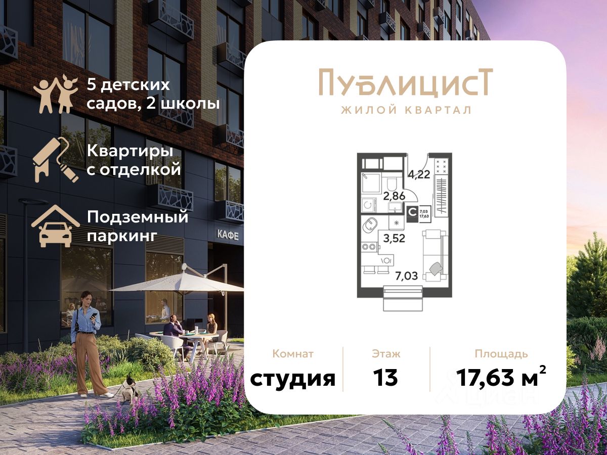 В продаже студия площадью 17.63 кв. м на 13 этаже. Квартира расположена в современном жилом комплексе "Публицист" от DOGMA, в корпусе 11.