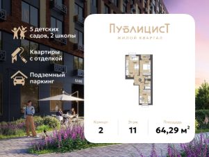 В продаже 2-комнатная квартира площадью 64.29 кв. м на 11 этаже. Квартира расположена в современном жилом комплексе "Публицист" от DOGMA, в корпусе 11.