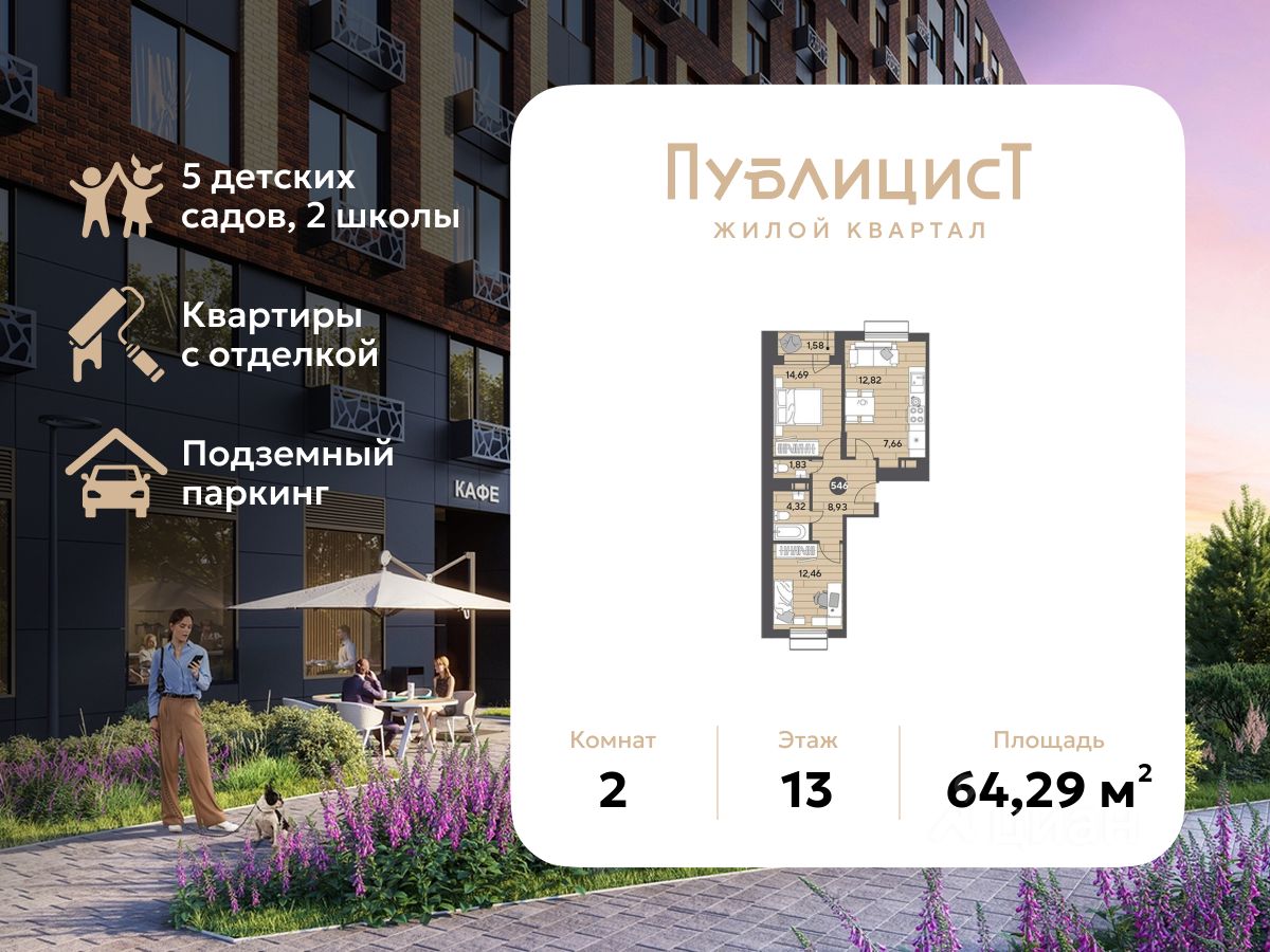В продаже 2-комнатная квартира площадью 64.29 кв. м на 13 этаже. Квартира расположена в современном жилом комплексе "Публицист" от DOGMA, в корпусе 11.