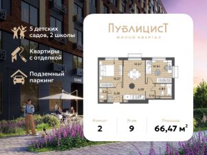 В продаже 2-комнатная квартира площадью 66.47 кв. м на 9 этаже. Квартира расположена в современном жилом комплексе "Публицист" от DOGMA, в корпусе 10.