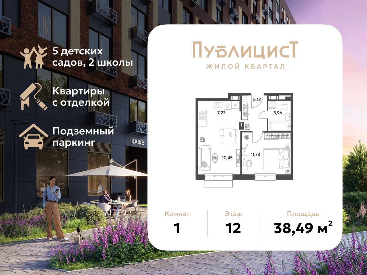 В продаже 1-комнатная квартира площадью 38.49 кв. м на 12 этаже. Квартира расположена в современном жилом комплексе "Публицист" от DOGMA, в корпусе 7. Акция! В честь дня рождения компании DOGMA приобретайте квартиру в ЖК "Публицист" со скидкой до 14%! Успейте оформить покупку жилья на выгодных условиях до 31 марта!