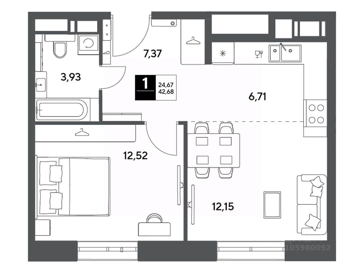 В продаже 1-комнатная квартира площадью 42.68 кв. м на 5 этаже. Квартира расположена в современном жилом комплексе "Публицист" от DOGMA, в корпусе 7.