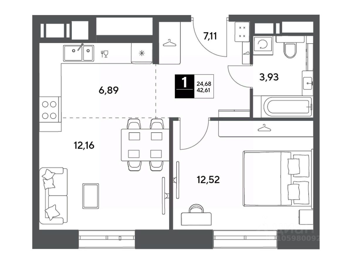 В продаже 1-комнатная квартира площадью 42.61 кв. м на 5 этаже. Квартира расположена в современном жилом комплексе "Публицист" от DOGMA, в корпусе 7.