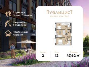 В продаже 2-комнатная квартира площадью 47.62 кв. м на 12 этаже. Квартира расположена в современном жилом комплексе "Публицист" от DOGMA, в корпусе 10.